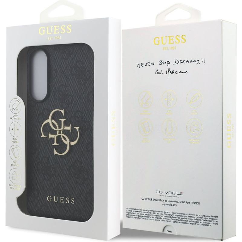 Prémiový zadní kryt Guess PU 4G Metal Logo se vyznačuje elegantním, charakteristickým 4G vzorem, doplněným o logo GUESS.